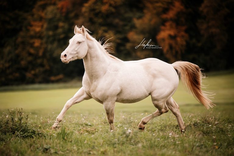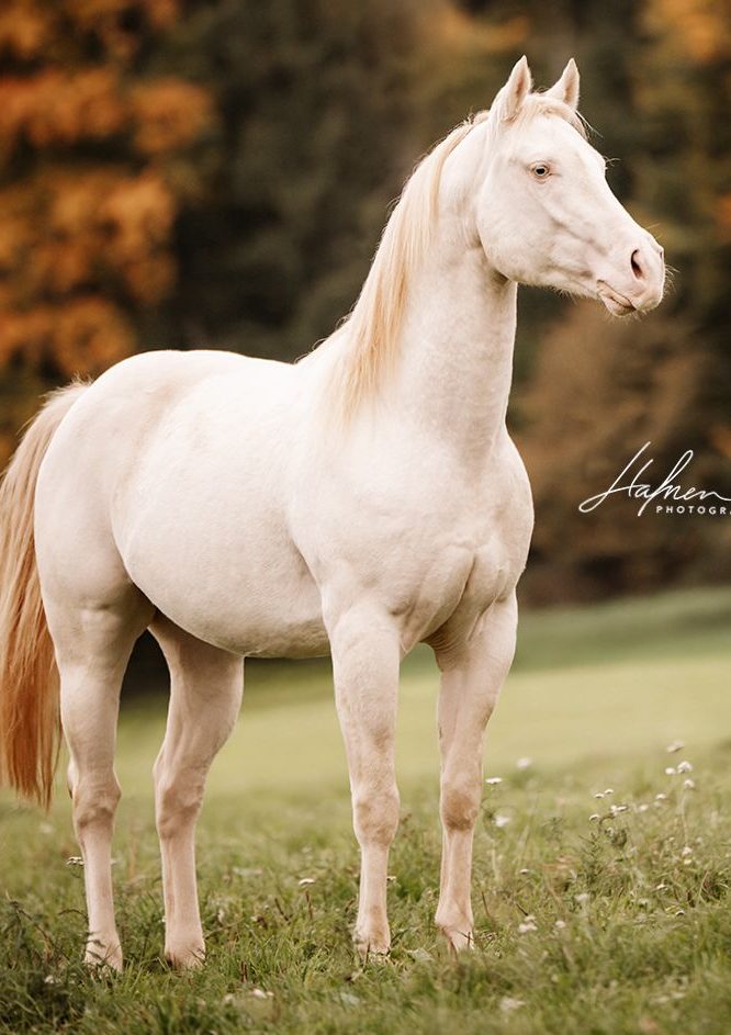Außerdem ist dieser perfekte Hengst noch gepaart mit einer mega Farbkombination und daher auch für alle Farbzüchter sehr spannend! Smokey Cream Dun Champagne – bedeutet: reinerbig schwarz, reinerbig Cream und trägt dazu ein Dun-, sowie ein Champagne Gen und ist 7 Panel N/N !!!